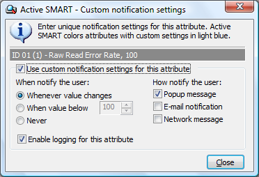 S.M.A.R.T. attribute custom notification settings